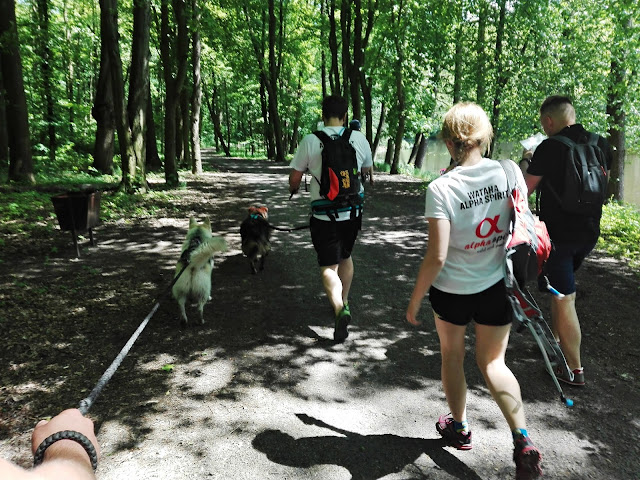 Apacz ekscytował się coraz bardziej razem z przybywaniem nowych psich uczestników. Przekrzykiwali i nakręcali się z ziomeczkiem Bohunem na zmianę z zaczepkami i zabawą. My podziwialiśmy psiaki od najmniejszych Yorków i Ratlerków po ogromne Dogi, Malamuty i Wilczaki <3 Pełen urodzaj! W międzyczasie odbyły się mini pokazy frisbee i agility we wcześniej przygotowanej zagrodzie. Równo 15 minut przed planowanym startem wszyscy dostali mapy z zaznaczonymi punktami a organizator przedstawił zasady i cenne wskazówki. Punktów do zaliczenia było aż 18 rozsianych po Lesie Łagiewnickim na trasie mierzącej 25 km. A oprócz nich były 3 dodatkowe z zadaniem do wykonania. Kolejność zdobywania punktów była dowolna jak i ich ilość. Wystarczyło zebrać pięć punktów pokonując jakieś 10 km aby wynik został zaliczony. Najważniejsze aby zmieścić się w limicie czasowym - 6 godzin. Po przekroczeniu tej normy wynik został niezaliczony. Tuz przed godziną 11 około setka uczestników ustawiła się pod dmuchanym łukiem gotowa do startu. Nastąpiło tradycyjne odliczanie i ruszyli ku przygodzie!
